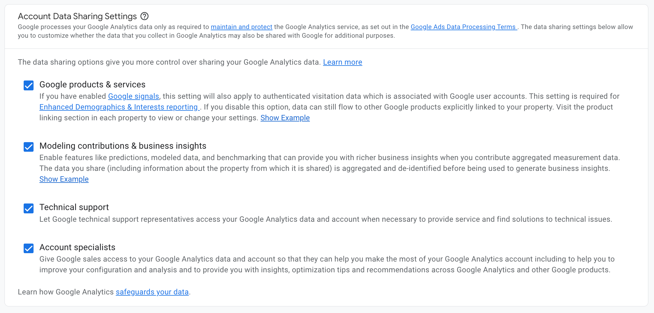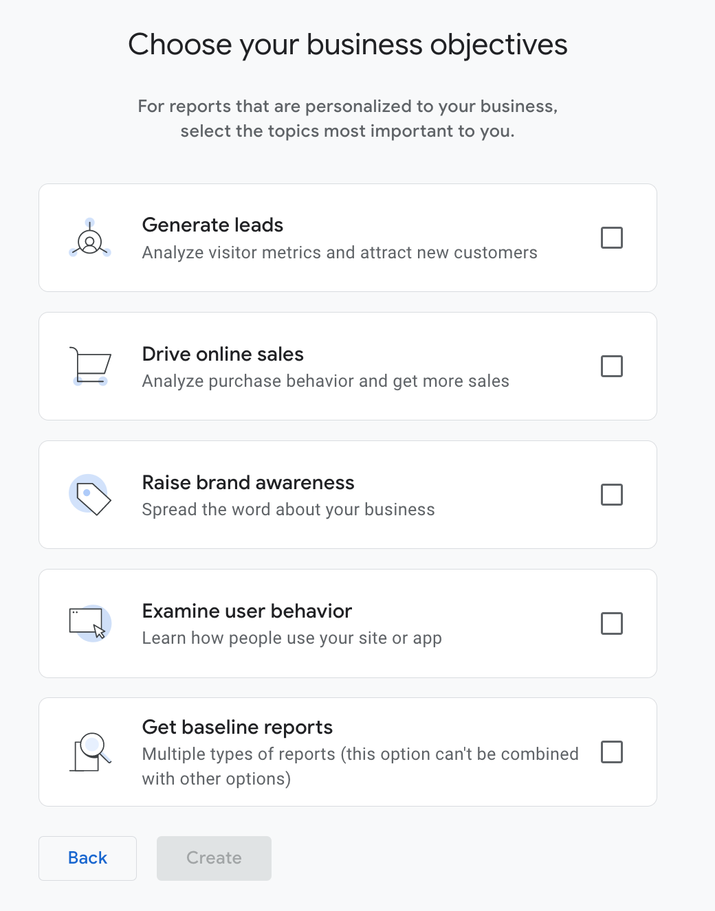 Under ‘Choose Your Business Objectives’ you should use these options to determine which types of reports you want the property to display: