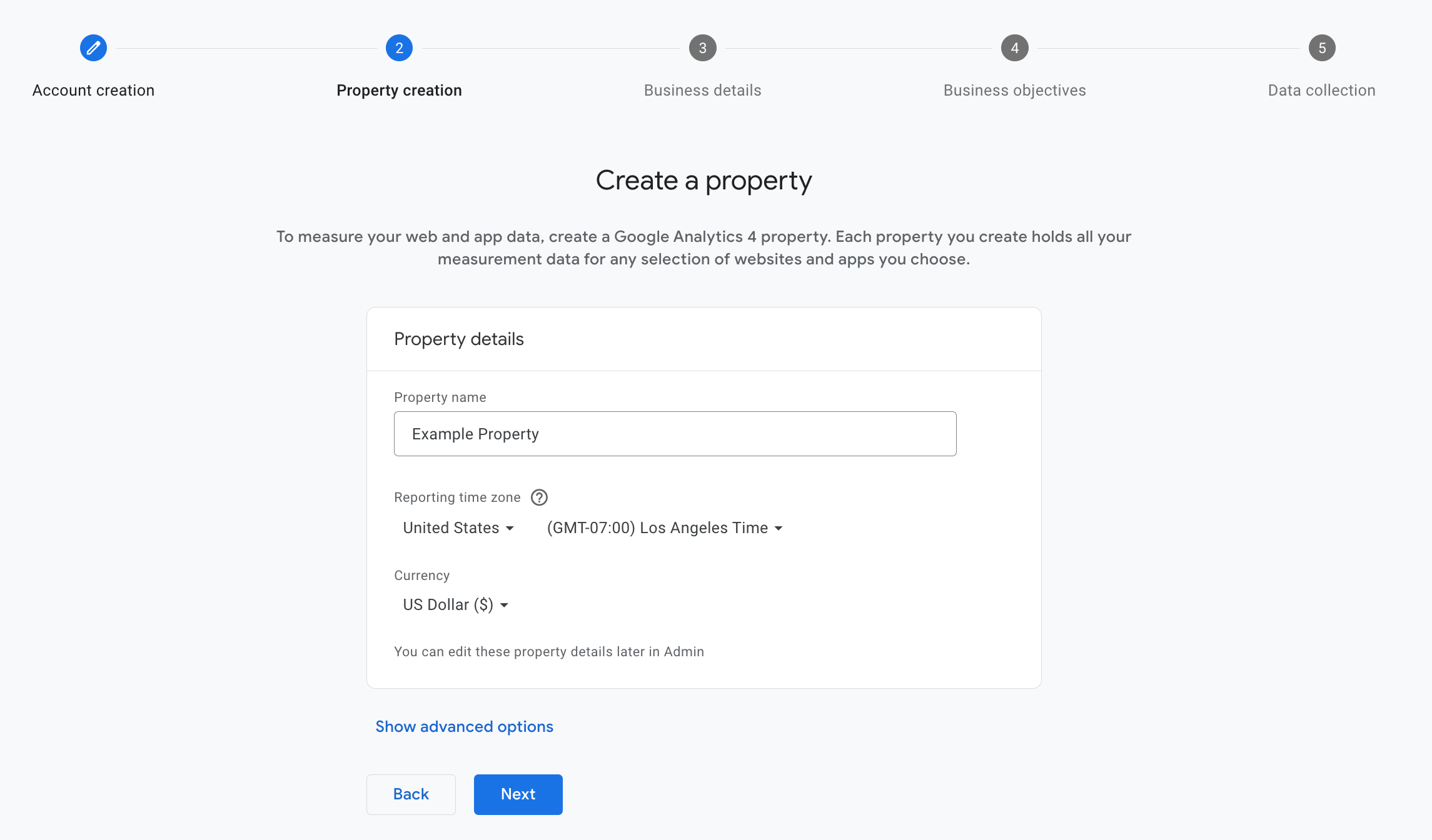 While the property name can be anything you like, we would recommend that the time zone and currency you select match those of your website.