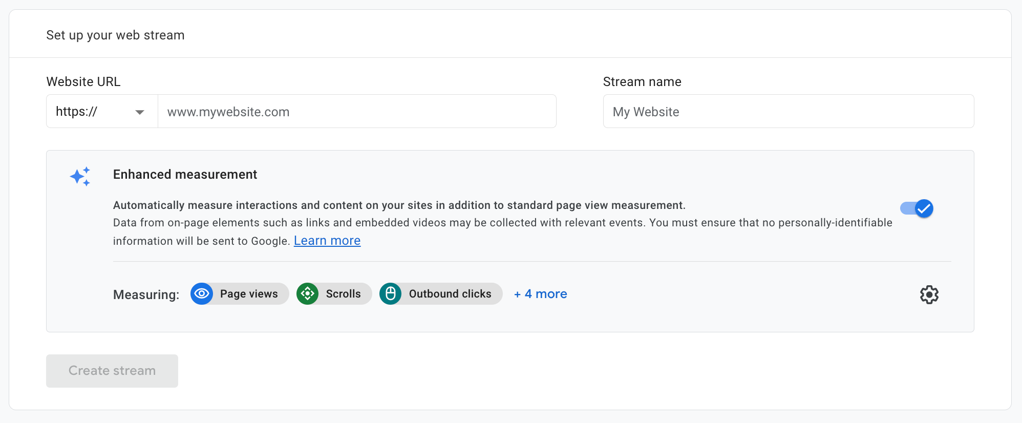 You can then choose if you want ‘Enhanced Measurement’ turned on. To learn more about enhanced measurement, please click here.