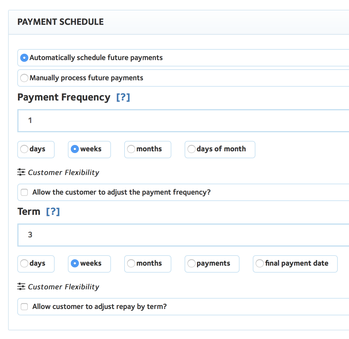You can automatically apply custom payment plan terms depending on pre-set checkout criteria and offer both automated payment plans and manually payment plans.